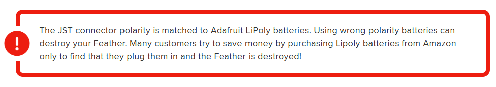 For LiPo batteries we strongly suggest the Adafruit 500 mAh battery. Some after market batteries could have the Positive/Negative wires in different positions which will fry the board. ALWAYS CHECK ORIENTATION MATCHES THE SYMBOLS ON THE BOARD!